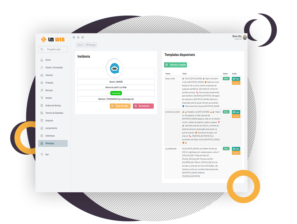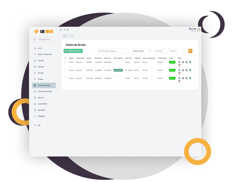 O LM WEB vai muito além de uma simples Ordem de Serviço. Com ele, você cadastra seus serviços, controla estoque de peças e produtos, acompanha receitas e despesas da sua oficina e ainda conta com integração total ao WhatsApp. Envie atualizações, lembretes e mensagens automáticas para seus clientes com agilidade e profissionalismo.